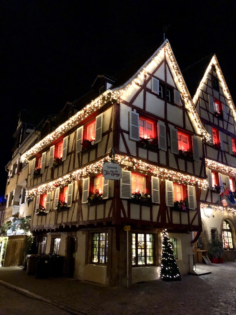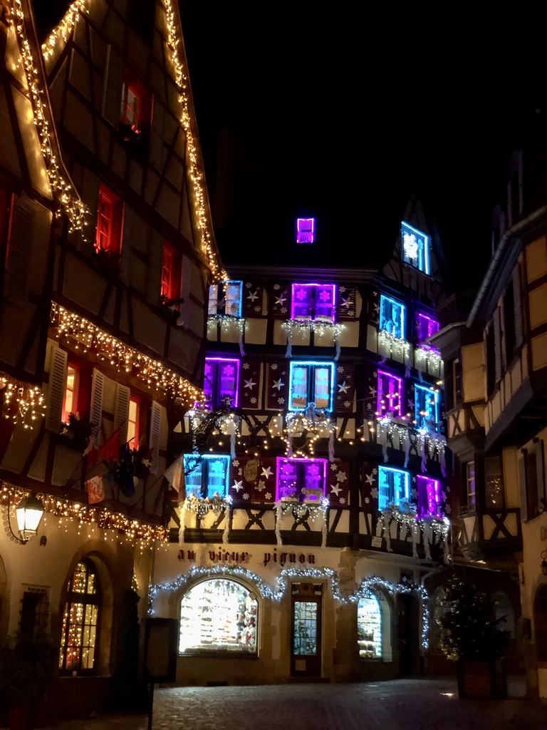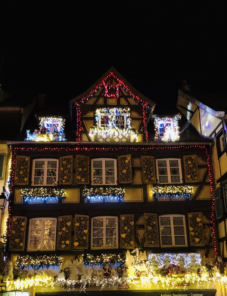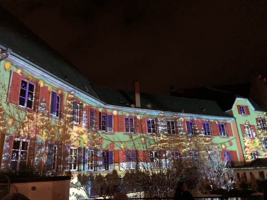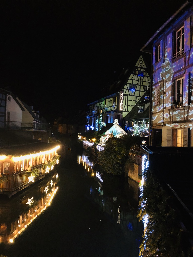 Nous arrivons par le train à Colmar et rejoignons notre Airbnb à pied. Nous sommes étonnés car la vieille ville est presque totalement vide alors qu’il est seulement 22 heures, un vendredi soir. Les restaurants sont déjà en train de fermer… Nous posons nos affaires et faisons un premier tour à pied pour profiter des illuminations car elles sont très nombreuses : guirlandes lumineuses, décorations, mais aussi projection sur certaines façades des bâtiments.