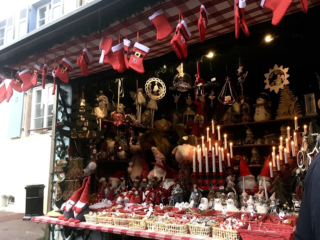 Une fois les bagages déposés, nous faisons un tour des marchés de Noël en commençant par celui place des Dominicains que nous avions fait rapidement la veille. Nous y achetons du pain d’épice en vue du réveillon de Noël pour en faire des toast de foie gras. Nous achetons ensuite un Stollen, gâteau alsacien délicieux à la pâte d’amande et aux fruits secs. Nous étions ensuite ravis de trouver un stand vendant de jolies boules de Noël. J’étais d’autant plus heureuse de retrouver une boule achetée à Strasbourg que j’avais cassé l’an dernier en faisant le sapin. Il s’agissait en réalité de la boutique de Strasbourg qui avait un stand à Colmar ! La boutique s’appelle Un Noël en Alsace et propose toute l’année de très jolies décorations.