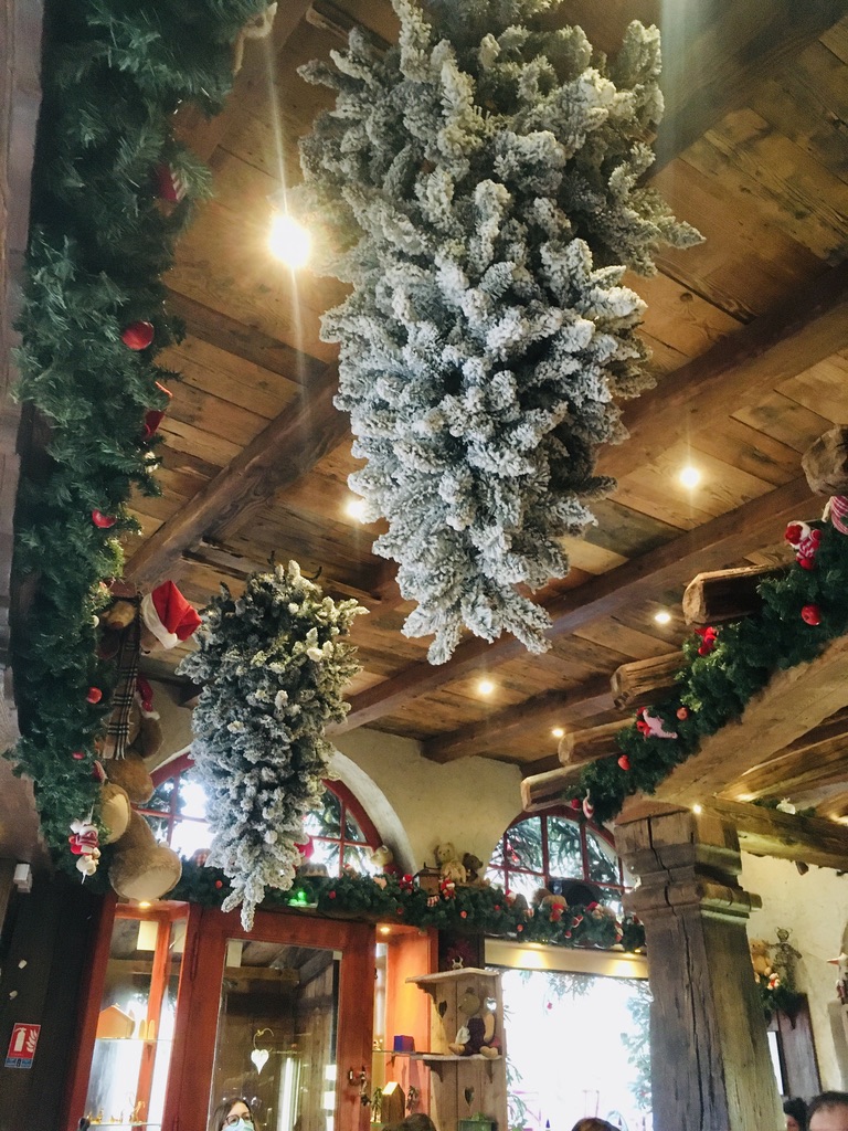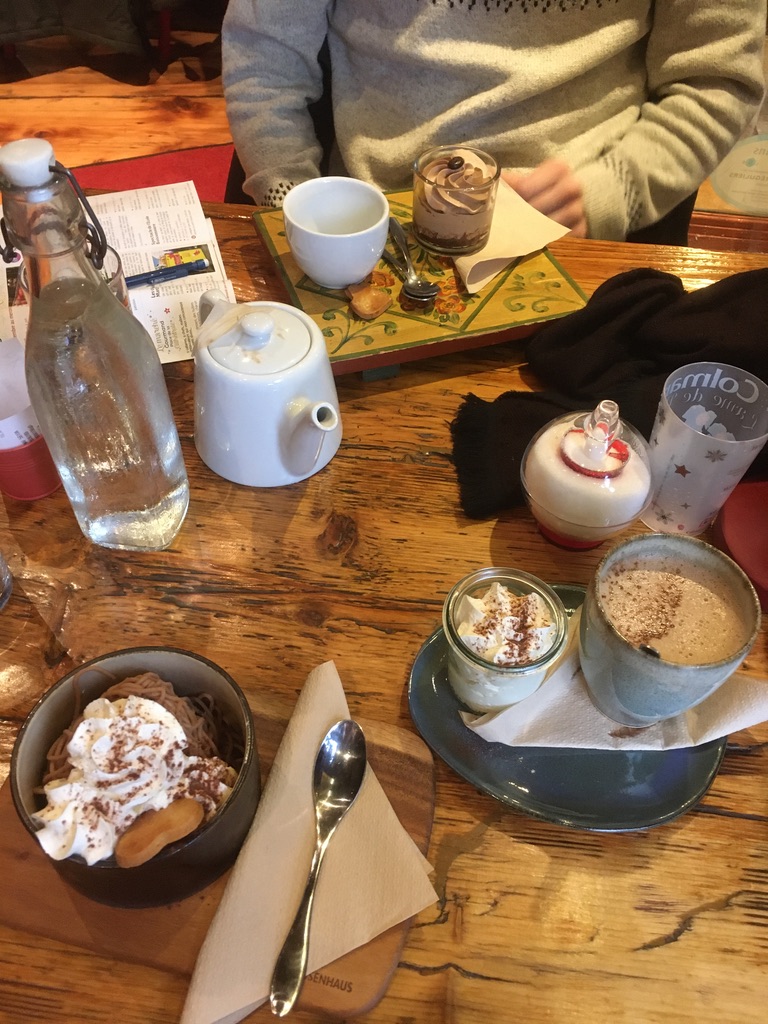 La pluie commence à tomber, et nous remontons jusque chez Jadis et Gourmande pour prendre le thé. Il est très tôt (14h30) et nous ne faisons pas la queue. Ce restaurant sert des tartes et gâteaux gigantesques pour un prix très raisonnable. Je commande le chocolat chaud maison délicieux, et un Mont-Blanc (meringue, chantilly et crème de marron). J’ai eu évidemment les yeux plus gros que le ventre car je ne suis pas parvenue à finir mon gâteau et ai demandé une boite pour l’emporter ! Jadis et Gourmande est un restaurant très bien décoré, très cosy, il est tout en bois : un véritable chalet de montagne.
