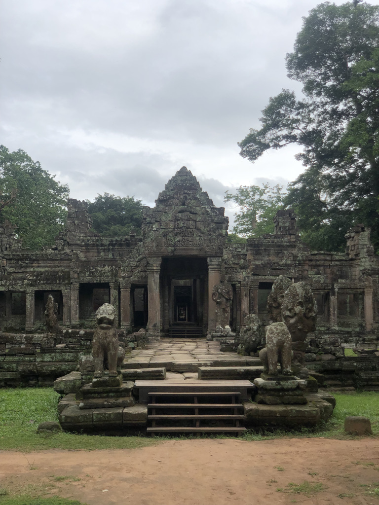 Nous sommes bien contents de faire une pause déjeuner pour nous sécher tant la pluie est devenue torrentielle. Notre guide nous amène dans un restaurant cambodgien face à un lac. Le restaurant est clairement fait pour les touristes qui visitent les temples avec un guide. La nourriture est correcte et les prix un peu plus élevés qu’ailleurs, mais évidemment on joue le jeu.