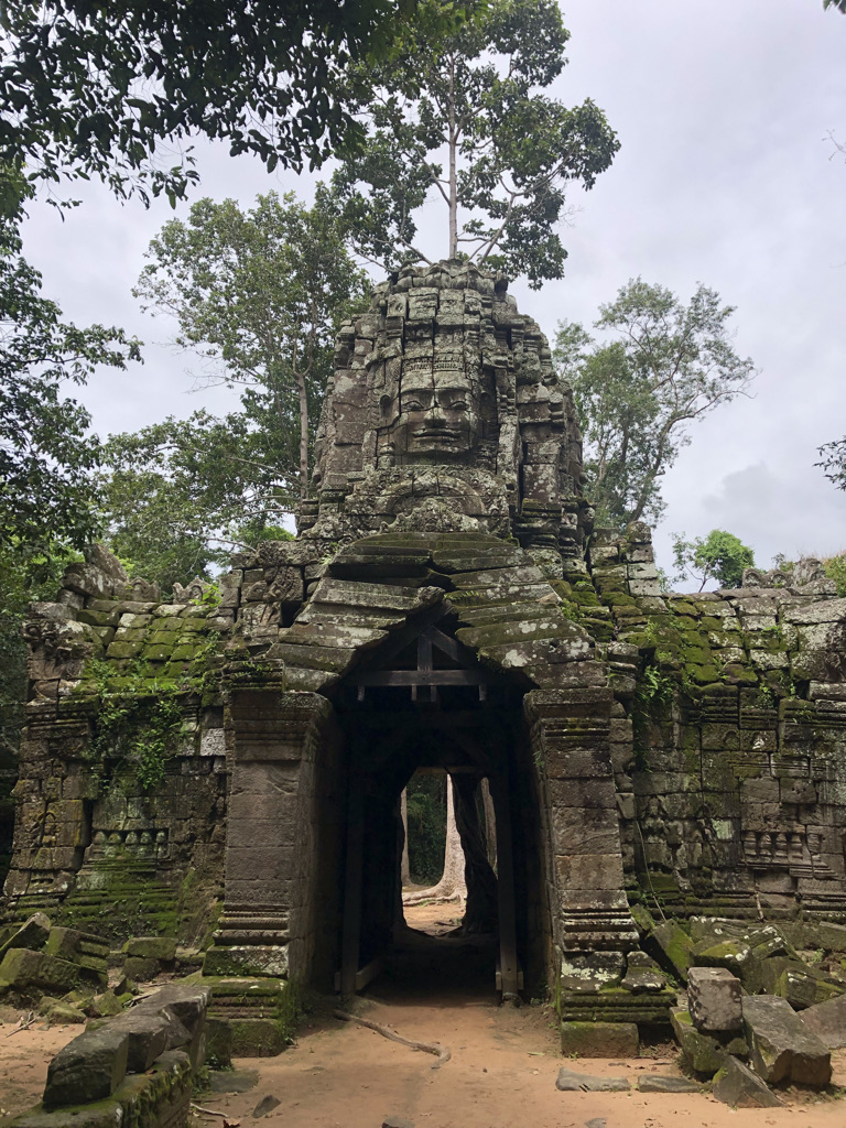Nous continuons avec le temple Ta Som, assez différent des autres puisqu’il ne ressemble pas à une pyramide, mais est davantage englouti dans la nature. Les arbres s’y mêlent. C’est très beau. On y retrouve les tours à visages qui rappelle le fameux temple Bayon.