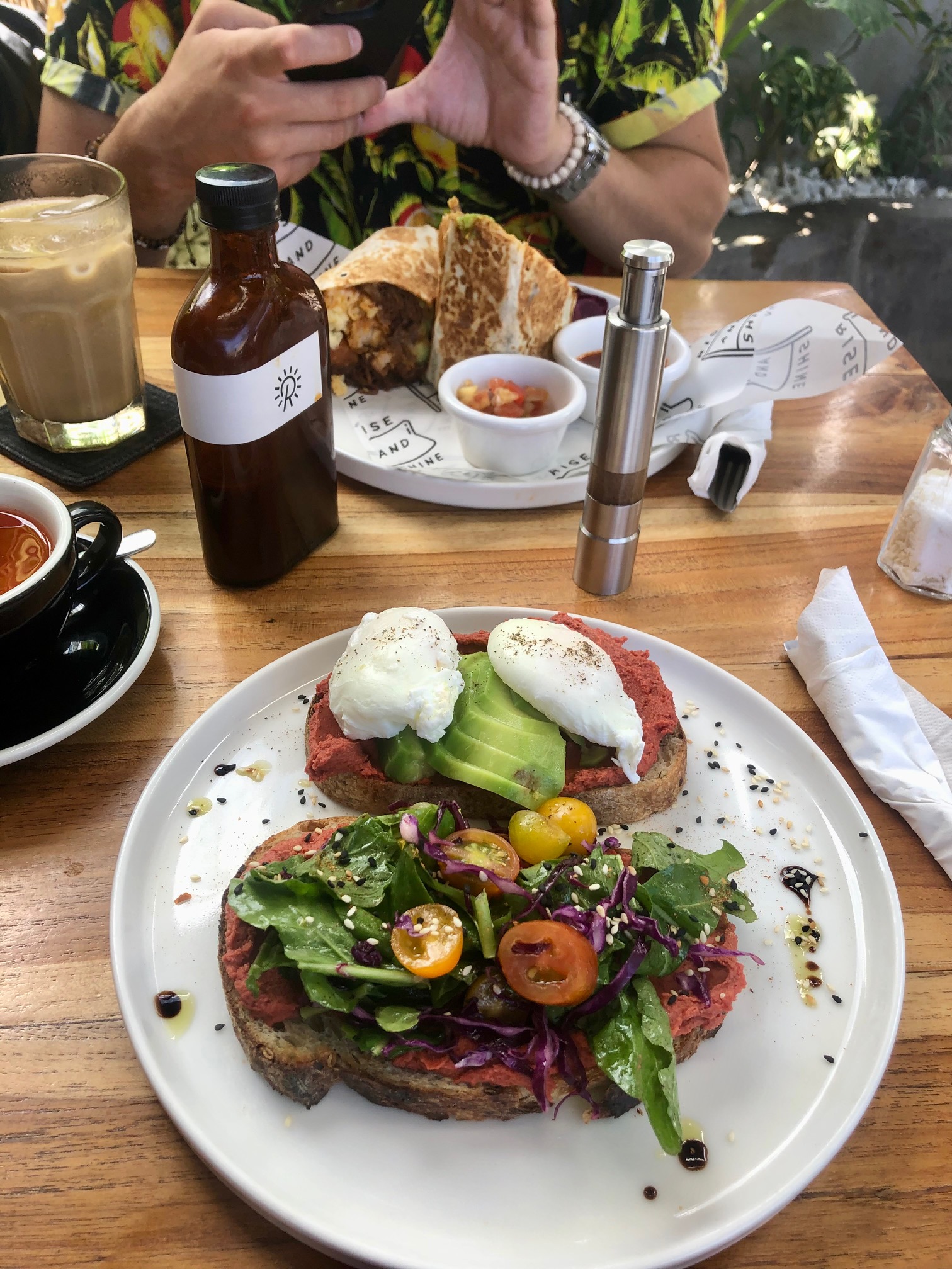 Dernière journée à Canggu et en Indonésie. On laisse nos bagages à l’hôtel et on part bruncher chez Rise and Shine : délicieux.