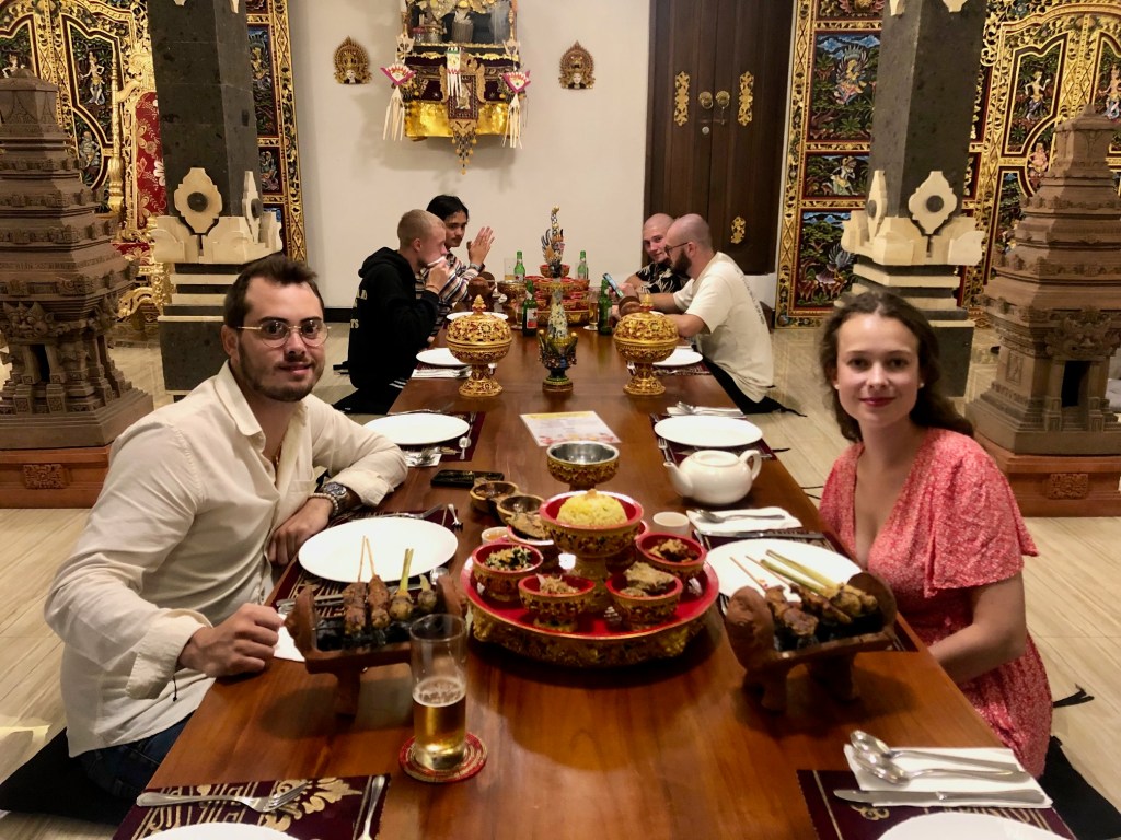 Ce matin c’est cours de cuisine au Café Wayan, situé à proximité de la Monkey Forest. Nous avons réservé la veille pour le lendemain, mais si vous vous y prenez en avance vous pouvez choisir un cours avec un menu qui vous correspond (chaque jour le menu change). Le lieu est très joli et nous avons fait ce cours avec un groupe de six Australiens avec qui nous avons bien rigolé. Le cours nous a coûté 350.000 IDR par personne (environ 20€) mais le prix affiché est désormais de 450.000 IDR par personne (environ 26€). On commence par un verre de bienvenue puis par une exploration du jardin dans lequel pousse de nombreux arbres et plantes. Pendant le cours on réalise tous ensemble cinq plats collectifs. Un livre de recette (en anglais) est prévu pour chaque participant. En réalité, on ne fait pas de la grande cuisine : on coupe les légumes, l’ail, les oignions, le gingembre et on remue un peu les casseroles. Malgré tout, on apprend et on comprend chaque étape de la recette. L’ambiance était vraiment hyper bonne grâce à notre groupe ! On goûte les plats à chaque étape de préparation. A la fin, on déjeune tous ensemble. Les quantités sont très importantes et vous pouvez prendre les restes à emporter, c’était délicieux ! Je recommande à 100%, c’était un moment vraiment superbe de notre voyage.