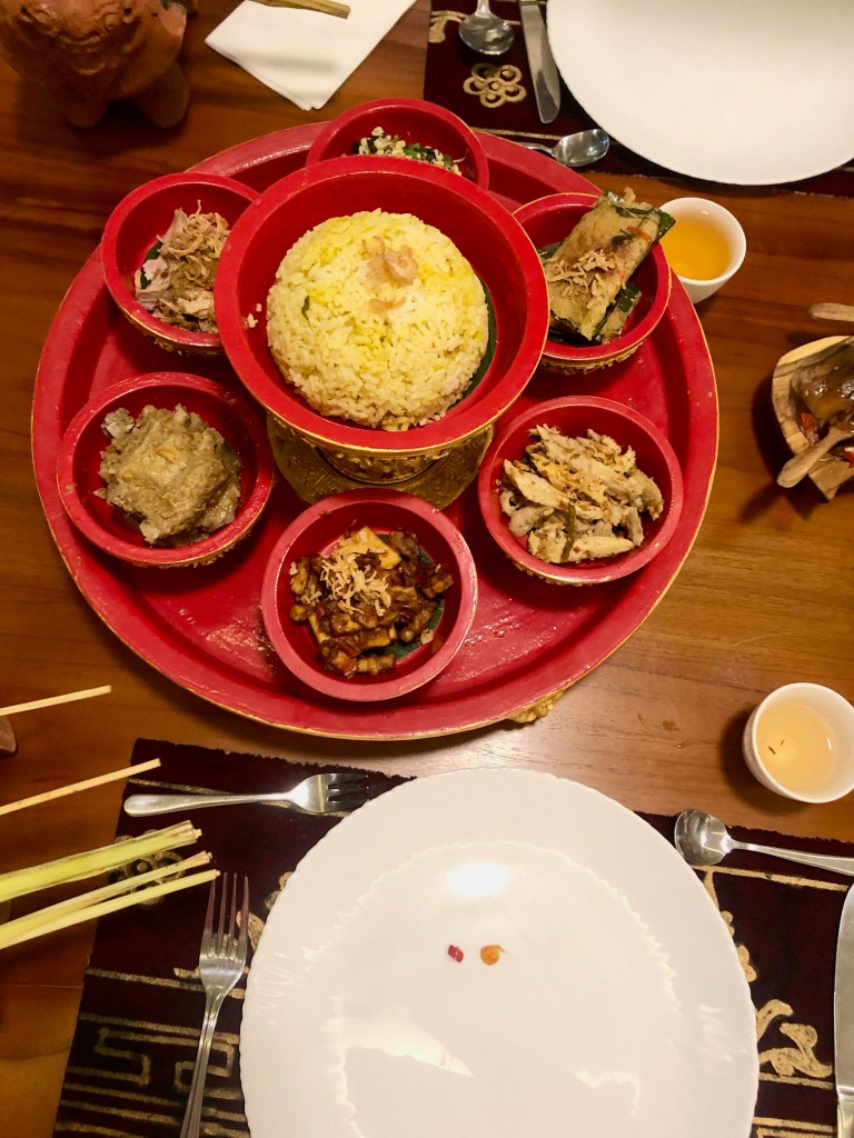 Après ce spectacle nous dinons dans un restaurant Indonésie qui propose un plat pour deux composés en réalité de pleins de petits plats ce qui permet de goûter plusieurs spécialités indonésiennes, nous dînons assis directement par terre. Le menu est assez cher pour Bali : 550.000 IDR pour deux (environ 32€). Le concept est sympa mais ce n’est pas un must d’Ubud.