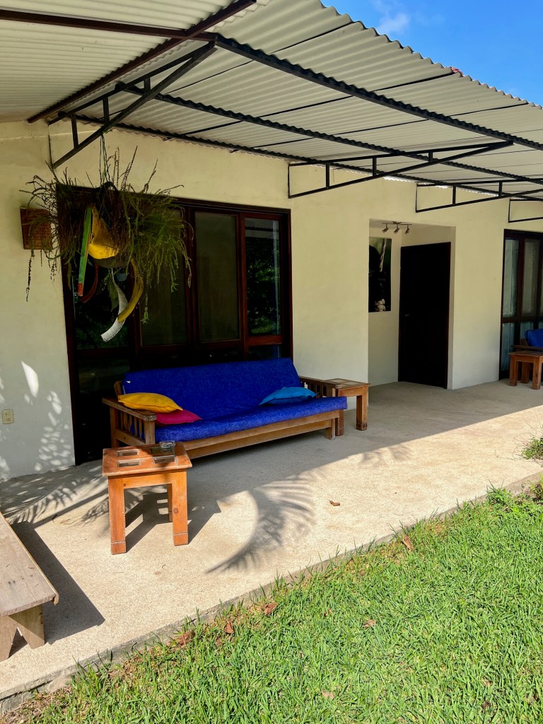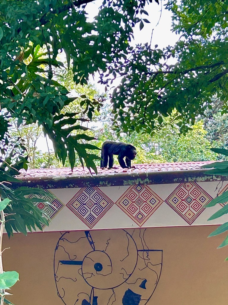 La route est un peu chaotique pour y accéder (chemin de cailloux irrégulier) mais on s’en sort très bien. L’hôtel dispose de six chambres et le lieu est magnifique : il s’agit d’un refuge pour animaux et notamment de singes. Ceux qui sont soignés sont en cage, puis ils sont remis en liberté. Le jardin est donc rempli de singe qui reste, même en liberté, dans les parages. On y voit (et entend) surtout des singes hurleurs ! Très impressionnant, son cri ressemble à celui d’un fauve. Dans le jardin, vous trouverez aussi beaucoup de chiens et de chats. Le lieu est particulièrement apaisant, on s’y sent bien immédiatement !