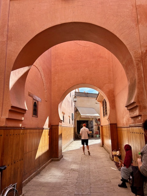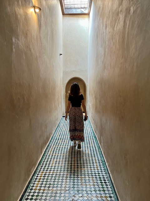 Malgré toutes ces péripéties, notre taxi, booké via notre riad, nous attendait à l’extérieur de l’aéroport. Le taxi nous a déposé à l’entrée de la médina car les voitures y sont interdites. De là, un bagagiste nous attendait pour nous guider jusqu’au riad car les ruelles de Marrakech sont un vrai labyrinthe.