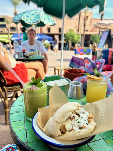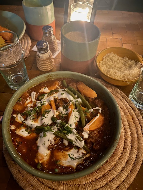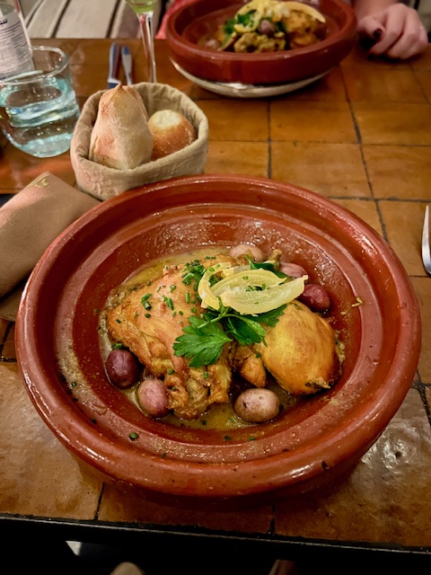 Pour le diner, nous allons sur le rooftop de Dar Dar. Pour ce restaurant, je vous conseille de réserver plusieurs semaines en avance. Nous y sommes pour 19h et c’est la golden hour, c’est magnifique. Le rooftop est très beau la nourriture est bonne mais les quantités sont assez petites et les prix plus élevés qu’ailleurs. Le restaurant sert de l’alcool et propose un large choix de cocktail mais les prix sont élevés : 17 euros. Le staff est très sympa et des animations sont proposées comme des magiciens et des musiciens. La carte bleue est acceptée. En conclusion, super ambiance mais ce n’est pas le restaurant le plus authentique de Marrakech.