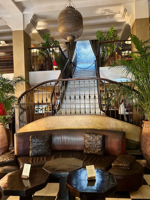 Nous nous rendons au fameux Café de la Poste, situé dans le même quartier, c’est une magnifique bâtisse coloniale où on peut manger de la nourriture française. Nous y prenons un thé à la menthe délicieux avant de rentrer à la Médina en descendant le boulevard Mohamed V à pied jusqu’à la Koutoubia. Pour rentrer dans le centre, on traverse également le jardin Cyber qui est un jardin très agréable (parc public et gratuit).