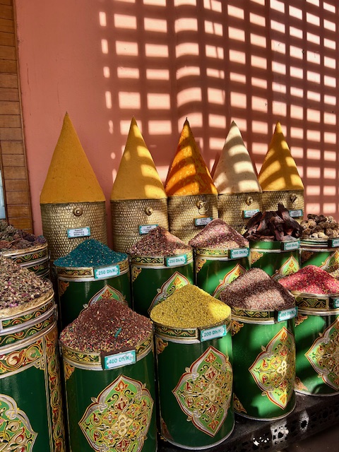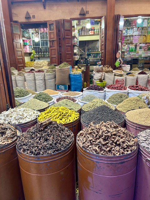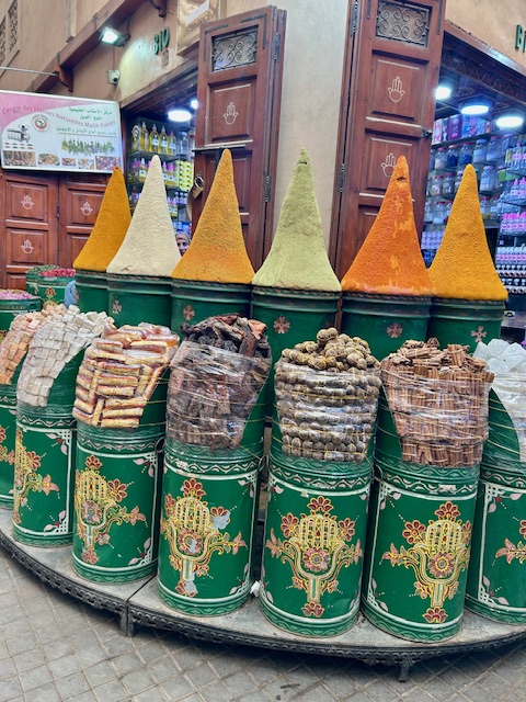 Nous rentrons en direction de la médina par le souk qui est bien moins fréquenté par les touristes. Il y a beaucoup de vendeurs d’épices. Nous nous arrêtons chez Khalid (première photo), un vendeur adorable pour faire le plein d’épices : cumin marocain, cannelle en écorce et en poudre, gingembre, ras el hanout de votre composition. Nous avons gouté un tas d’épices et Khalid broie tout devant nous. Tout est très parfumé !