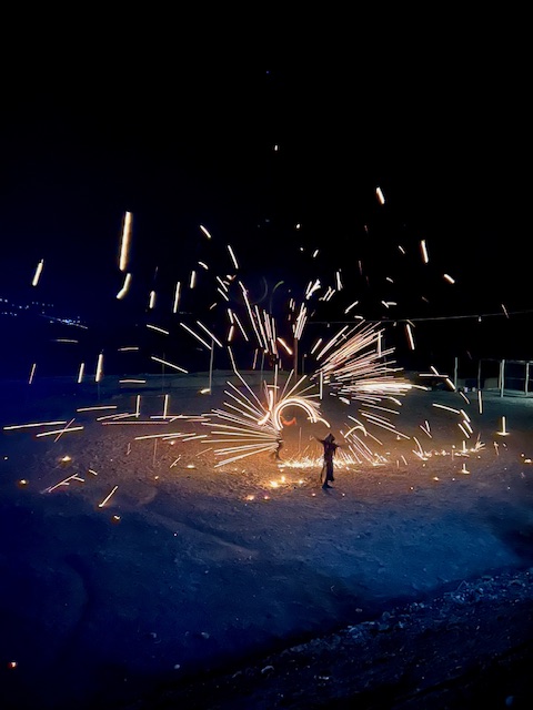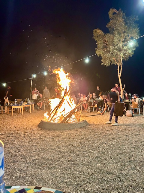 Nous rentrons juste à temps pour le diner qui est délicieux : soupe, couscous, tajine, gâteau et thé à la menthe ! Tout le long du diner, de la musique traditionnelle est jouée. Il y a également un spectacle de danse et de feu (plutôt kitch).
