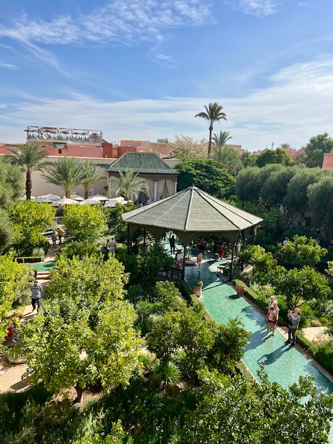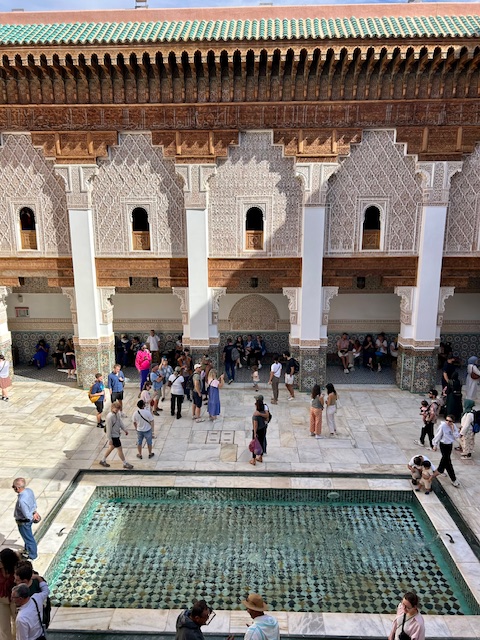 Dernière journée à Marrakech. Ce matin nous visitions le Jardin Secret, lieu que j’avais beaucoup vu sur les réseaux sociaux mais que Katy, notre hôte ne nous avait pas nécessairement recommandé et nous aurions dû l’écouter ! L’entrée est à 100 dirhams par adulte et 40 dirhams supplémentaire si vous souhaitez grimper sur la tour (soit un prix total d’environ 13€). Le lieu est beau mais le prix est très élevé par rapport à la taille du lieu. La visite est très rapide. Vous pouvez ensuite monter sur la tour ce qui vous permet d’avoir une vue panoramique sur Marrakech, c’est très sympa. Un guide est présent sur la tour pour expliquer tous les monuments qu’on peut y voir. Si vous visitez le jardin, je vous conseille d’y ajouter la montée sur la tour qui a un vrai intérêt.