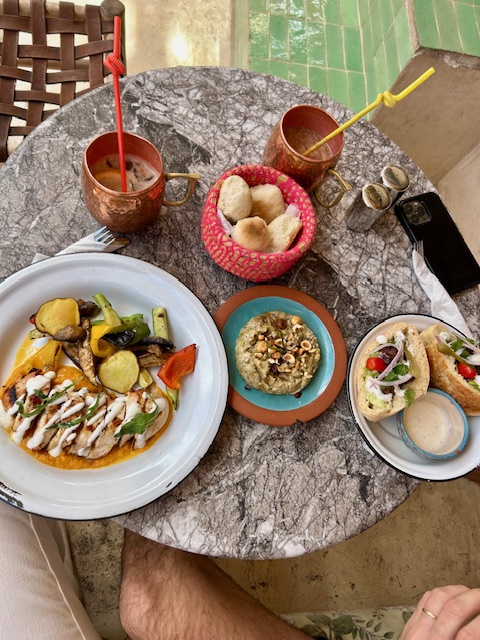 Nous terminons la journée par un diner sur le rooftop du restaurant Un Déjeuner à Marrakech situé à proximité de notre riad. Il nous a été recommandé par notre hôte. Le service est parfait, la nourriture excellente. Je vous recommande notamment les cocktails sans alcool, le houmous et le poulet. Les cartes bancaires sont acceptées sans frais supplémentaire.