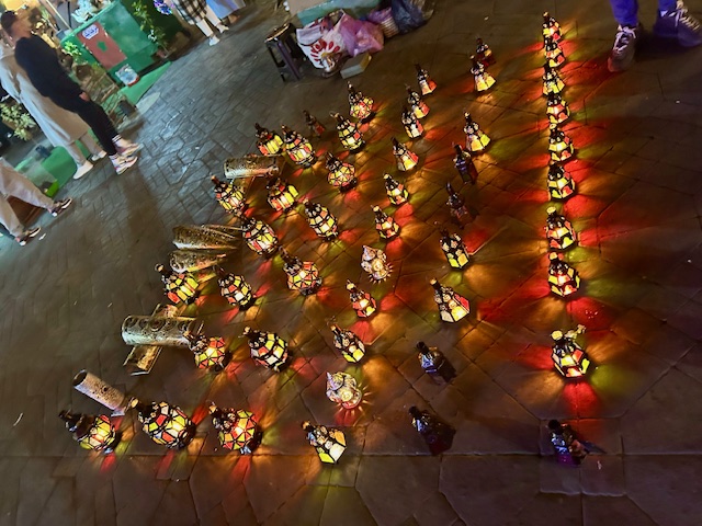 Nous repassons de nuit sur place Jemaa el-Fna : l’ambiance est radicalement différente par rapport à celle de jour ! La place est noire de monde. Je vous recommande de découvrir cette place à la fois de jour et de nuit. Le soir vous pouvez y manger, il y a des restaurants ambulants partout avec des tables et des chaises.